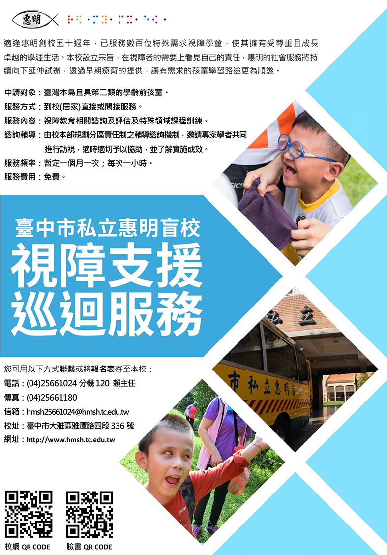 臺中市大雅區私立惠明盲校深耕視障教育六十餘年,是國內二十八所特殊教育學校中,唯一的私立特殊教育學校,免費提供6到22歲視覺障礙及視多重障礙學童就讀及住宿,透過適性教育及生活訓練,培養學童獨立生活的能力。惠明盲校從創校至今已服務數百名特殊需求視障兒童與家庭。去年為惠明盲校50週年校慶,校方開辦「全國性視障支援巡迴計劃」,由校內專業教師外展到全國各地視障家庭中提供到宅早療服務,給無法到惠明盲校學習的視障者與資源不足之視障家庭支持與協助。除此之外,惠明盲校媒合各地區特教資源中心成立外展據點,並打造適合視障生學習的情境空間,及早介入協助視障兒進行早療。