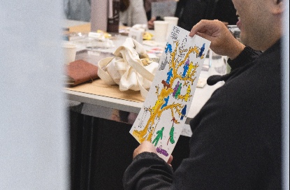 從圖紙上可看到各種姿態的人形,這些人形都代表不同的情緒或心理狀態,能引導不善於表達或較為內向的個案傳達尚未言說的想法。為協助大家理解 Blob Tree 的運用原理,講師首先引導學員依照自身生命經歷繪製自己的 Blob Tree ,完成後再與組員分享自己的創作構想及象徵意涵。面對空白的紙張,大家各自發揮創意,有學員將不同位置的人形畫上同樣顏色,代表不同時期的自己;也有學員在既有的圖形框架外,另增添綠葉、草地等裝飾。圖紙就像每個人內心世界的延伸,從其描繪的色彩、圖像可便可窺見每位學員獨特的生命故事。