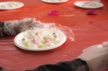 當湯圓可以像黏土一樣任意塑形,當湯圓不侷限於紅白兩色,長輩們會創造出什麼造型?在「巧手捏捏搓湯圓」活動中,我們以紅麴、抹茶、可可粉揉製各色麵團,邀長輩發揮天馬行空的創意捏製湯圓,透過塑形湯圓的手部動作,不僅有助於刺激大腦神經通路,也可促進長輩身體血液循環。起初長輩們多半搓著圓潤飽滿的傳統圓形,但在志工引導與示範下漸漸展現創意巧思,捏出可愛雪人、玲瓏骰等有趣造型,也有長輩大玩拼色,甚至巧用竹炭糊在湯圓上寫字,這些麵團經過長輩的巧手都成了一顆顆湯圓都成了藝術品。